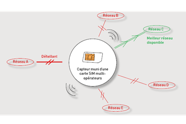 Ces cartes répondent à une défaillance réseau. Celle-ci peut être causée par une rupture de réseau, une coupure de communication avec l’objet, un réseau non disponible dans certaines régions ou un débit insuffisant etc. Grâce aux cartes SIM multi-opérateurs, les capteurs se connectent au réseau disponible à l’instant T qu’ils soient fixe ou en mouvement. Les cartes SIM ont la capacité de scanner le meilleur réseau disponible partout dans le monde. Ainsi en cas de problème, une carte SIM va automatiquement faire un roaming des réseaux présents dans les alentours et va se connecter à celui dont le débit est le meilleur.